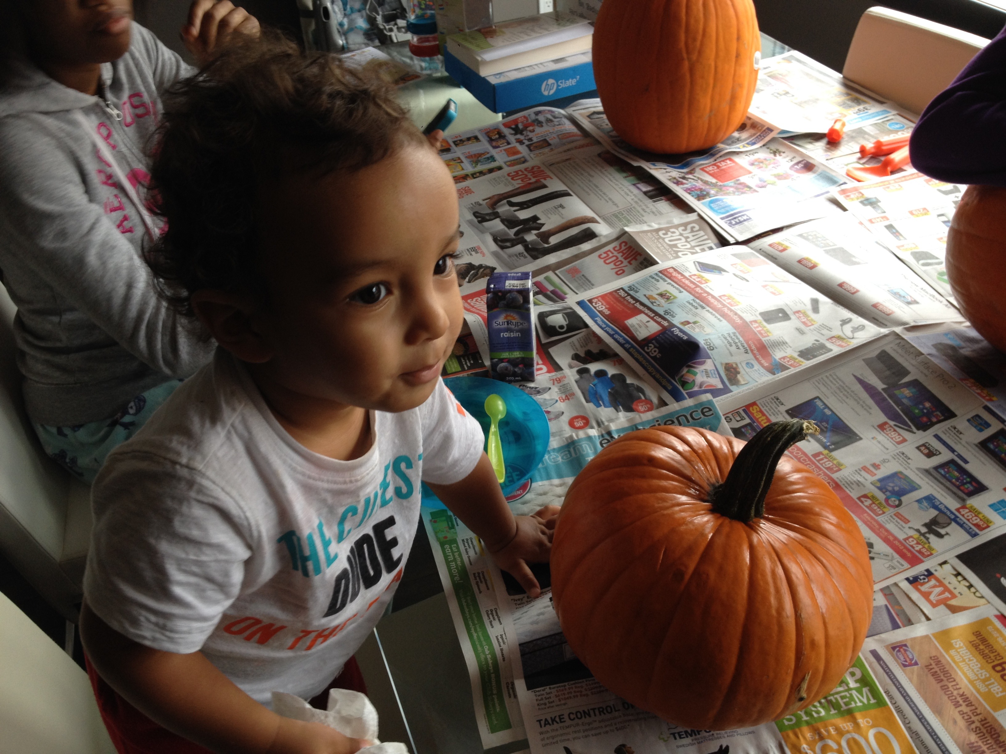 1) We bought our pumpkins at the local grocery store – one for each child. This is our son’s first year to actually help carve a pumpkin, he was pretty excited!