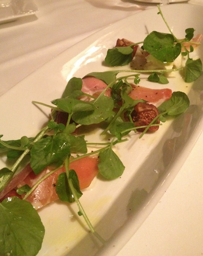 More fresh ingredients on our plates! Essentially a salad, this appetizer had prosciutto, fig, burrata (soft cheese, like a fresh young cheese), olive oil, lemon juice, watercress and chili pine nuts. Divine! Again, super flavourful and light. The sweetness of the fig, smokiness of the prosciutto, and tartness of the lemon juice worked really well together.