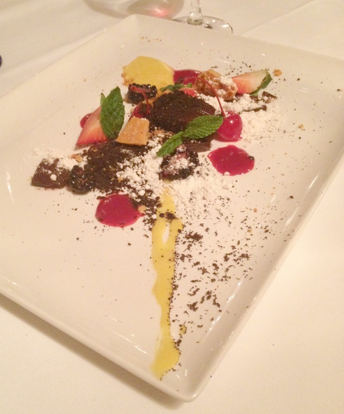 For the chocolate lovers, this Sweet Ending included: chocolate ganache, lemon curd, chocolate soil, sponge toffee, raspberry coulis, berries, drunken cherries, and peanut butter powder.