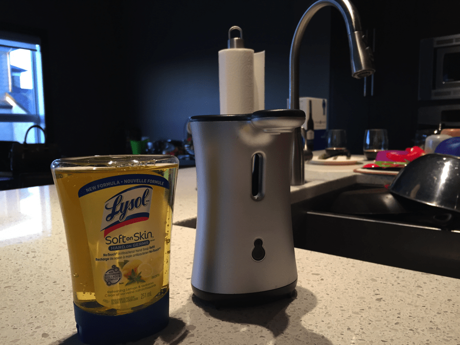 At every sink in our house we have some type of antibacterial soap available for use. Sometimes we use cleansing wipes for our son’s hands as well. However, the kitchen, more specifically the island in the kitchen, is our main hub of activity so I figured it was the perfect placement for the Lysol® No-Touch™ Hand Soap System.